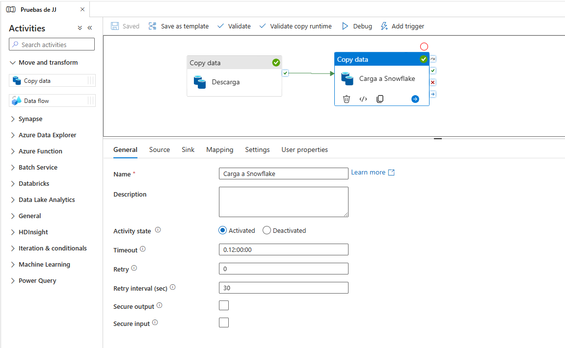 Por exigencias del guión estoy trabajando con Data Factoy y Snowflake. Y cuando hay cosas que están bien hechas están bien hechas.